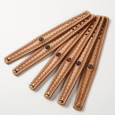 革の切り出し、刻印(アメリカ製)の打ち込み、手縫い等全て手作業にて行っております。1点1点違う表情をお楽しみください。