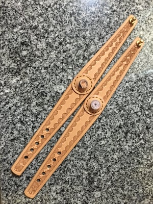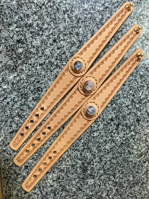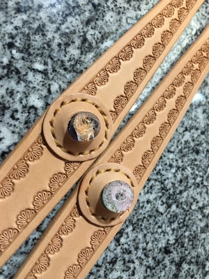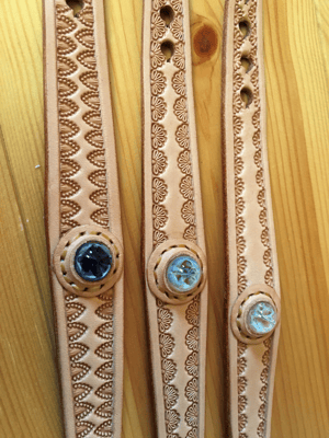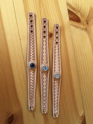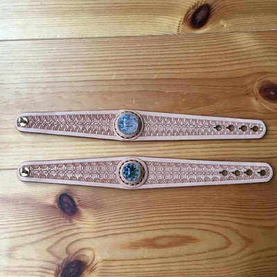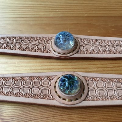ガラスを革で埋め込んだ作品です。革にはびっしり刻印を打ち込みました。